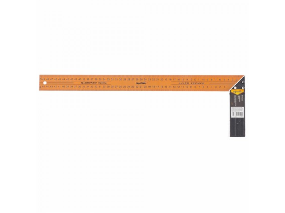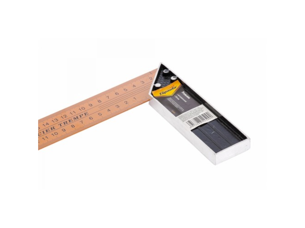 Металлический угольник с окрашенной поверхностью и двухсторонней разметкой полотна. Полотно угольника имеет двухстороннюю разметку. Предназначен для разметки и проверки прямых углов, а также для проверки угла 45 градусов при обработке и сборке изделий.