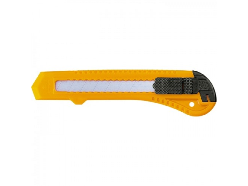 ож имеет пластмассовый корпус, кнопки выдвижения и фиксации лезвия. Замена лезвия осуществляется вручную через хвостовую часть ножа. Предназначен для разрезания бумаги, картона и прочих материалов, при котором не требуется большого усилия.