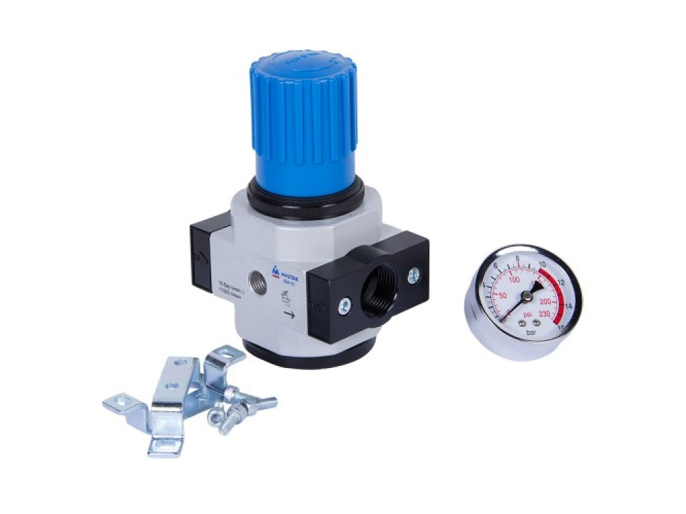 Манометр регулятор 3/4", МАСТАК 694-51 для регулировки давления сжатого воздуха в пневматической линии. Область применения: Автосервис, СТО. Конструкция устройства - Редуктор: выставление номинального давления на выходе, необходимого для нормальной работы инструментов и оборудования. Механизм редуктора встроен в блок фильтра. - Манометр: контроль давления, устанавливаемого редуктором. Манометр установлен на корпусе блока фильтра. Меры предосторожности - Соблюдайте правильность подключения в воздушную магистраль. - Не подключайте устройство к магистрали, давление в которой превышает максимально допустимое. Технические характеристики - Рабочее давление - 1,5 - 12 бар - Максимальное давление - 16 бар - Пропускная способность - 11500 л/мин - Рабочий диапазон температур от -10 до 60°С Соединение, резьба вход/выход 3/4” внутр. / 3/4” внутр. - Габариты - 250х115х70 мм