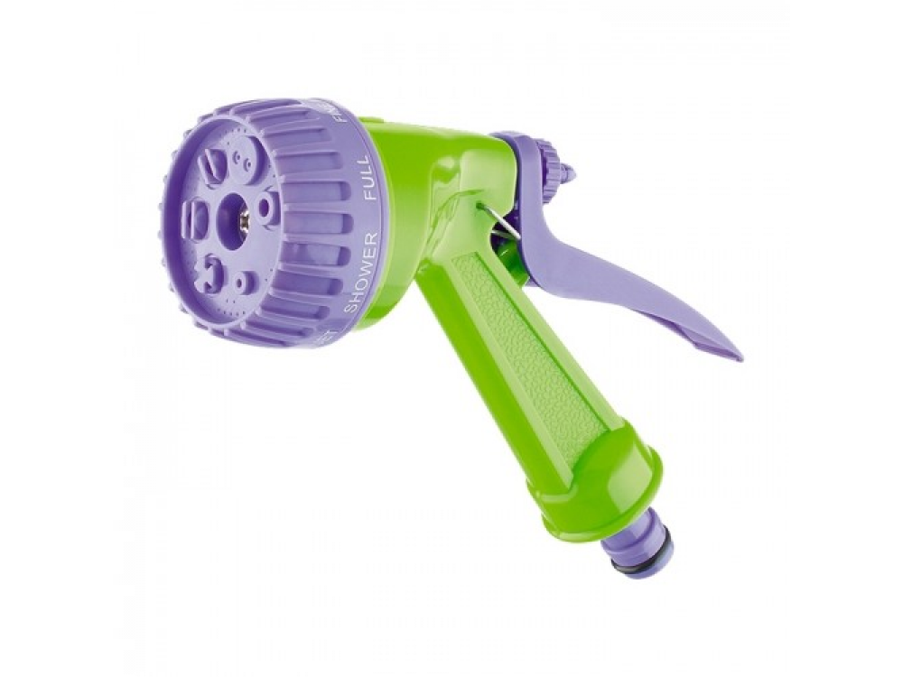 Пистолет-распылитель со штуцерной посадкой и курком, расположенным сзади. Оснащен регулируемой форсункой, что обеспечивает семь режимов полива: душ, режим задействования всех отверстий, мелкий туман, плоско-вертикальную струю, плоско-горизонтальную струю, туман, жесткую струя. Имеет фиксатор курка для непрерывной работы.