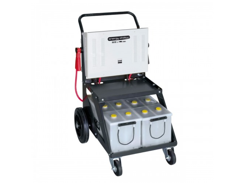 Пуско-зарядное устройство GYS Energy Station применяется для запуска автомобилей с аккумуляторами 12 В / 24 В. Тележка позволяет разместить 1 или 2 12-вольтовых аккумулятора (6 элементов по 2 В) ёмкостью до 180 A/часов каждый. Аппарат имеет 2 автоматических зарядных устройства для зарядки как внутренних аккумуляторов, так и внешних, а также аккумуляторный тестер. В режиме пуска, бортовая электроника автомобиля защищена от перенапряжения. Особенности: - Интегрированный тестер для проверки уровня зарядки внутренних батарей. - Автоматическая зарядка без надзора на 100% даже сильно разряженных батарей (Floating system - кривая WuoU) - Заряжает все виды батарей 12В или 24В с жидким или гелевым электролитом ёмкостью от 35 до 225 A/час. - Защита против инверсий полярности для зарядки внешних батарей. - Для упрощения передвижений и устранения проблемы прокола тележка оснащена 4 цельнолитыми колесами, 2 из которых направляющие. Технические характеристики: Наименование Значение Напряжение питания 200 В Аккумуляторные батареи для оснащения 120-170 Ач Выходное напряжение 12/24 В Емкость заряжаемых аккумуляторов 35-225 Ач Средний ток зарядки 2х15 А Эффективный ток зарядки 2х22 А Площадка под установку батарей 450х530 мм Габаритные размеры 700х620х920 мм Вес 35,5 кг